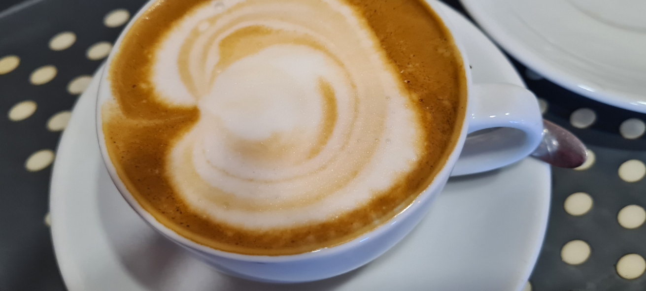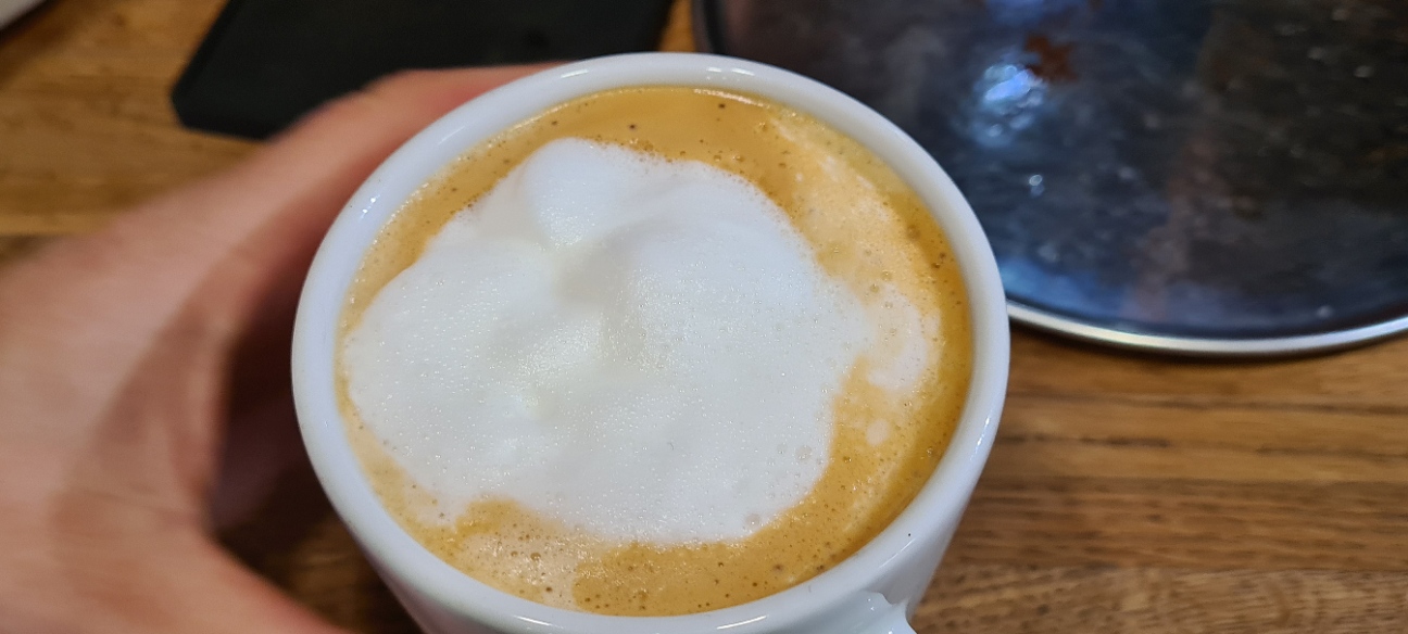 Espresso with steamed milk (i.e. a milky coffee)