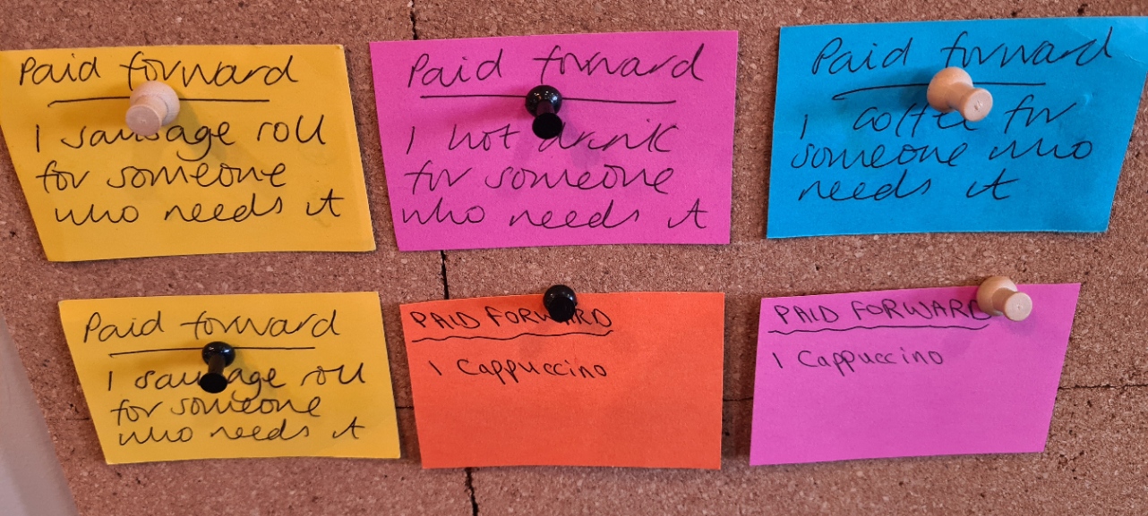 To help someone else out, all you need to do is to pay for something extra when you make a purchase. Just say at the till when you’re paying that you’d like to pay for a little extra. When you do buy the extra item or items, we write it on a slip of card and put it up on our board. Then, someone who is struggling to pay for food or drink can have something for free and we take the item or items off the board.